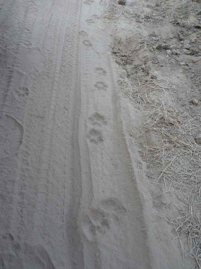 Lion paw marks on the dusty road.