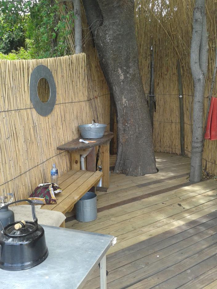 The large tree trunk came handy to hide from river traffic while showering!