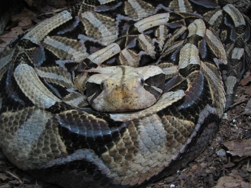 GaboonViper Next → Gaboon viper. Picture by No machine-readable author provided. Ltshears assumed (based on copyright claims). [Public domain], via Wikimedia Commons.