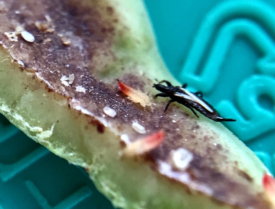 Adult Thryp (black) with nymphs and eggs.