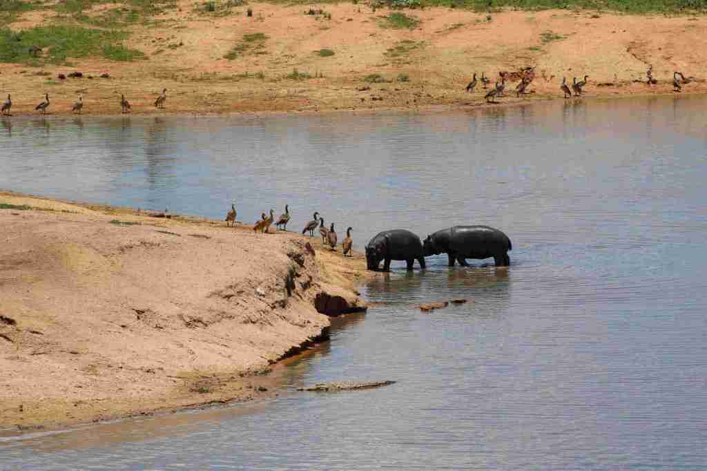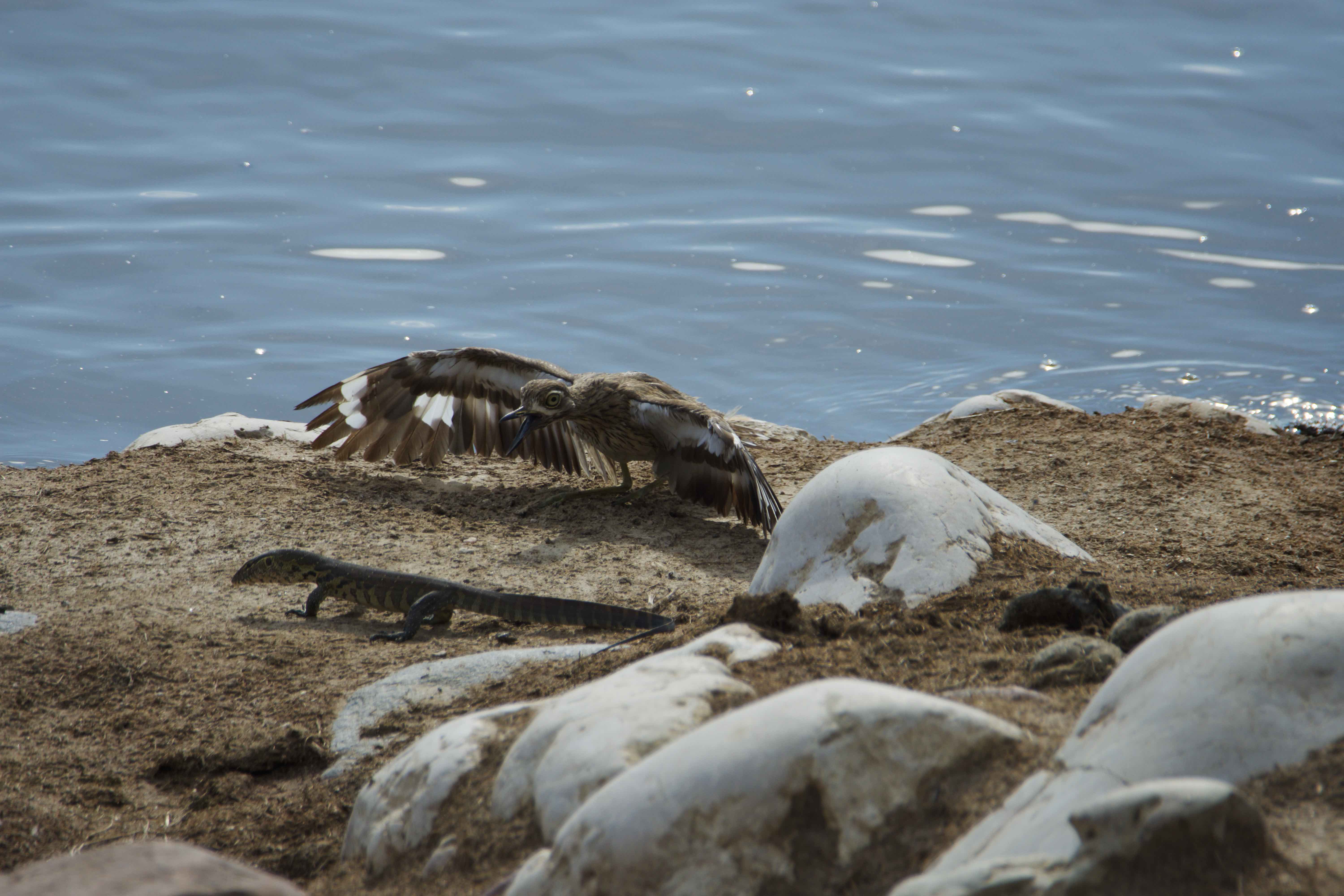 We counted twenty-three hippos and about half a dozen crocodiles at the dam as well as a large population of geese (both Egyptian and Spurwing) as well as a few Knob-billed ducks. The few resident Senegal thick-knees were there, busy protecting their nests against the threatening advances of the monitor lizards.