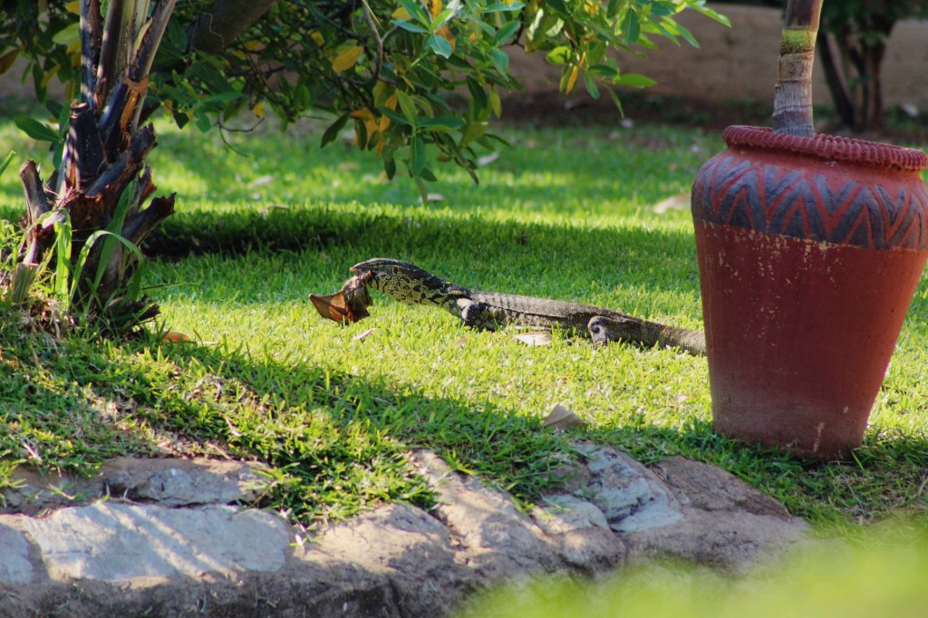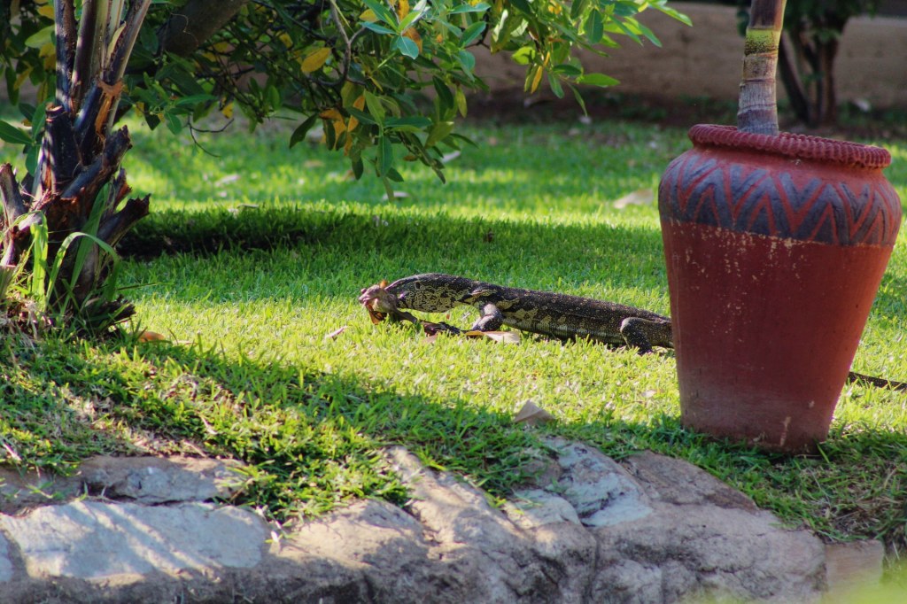 In September 2019, while walking through the grounds of the now defunct Kingdom hotel at Victoria Falls in Zimbabwe, we observed a monitor lizard eating what looked like a fruit-eating bat.