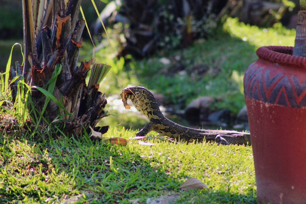 Unfortunately, we did not see if the bat was caught while alive or the monitor was feeding on a dead bat found on the ground of the hotel. The monitor consumed the entire bat.