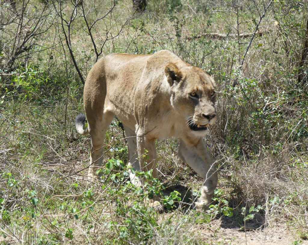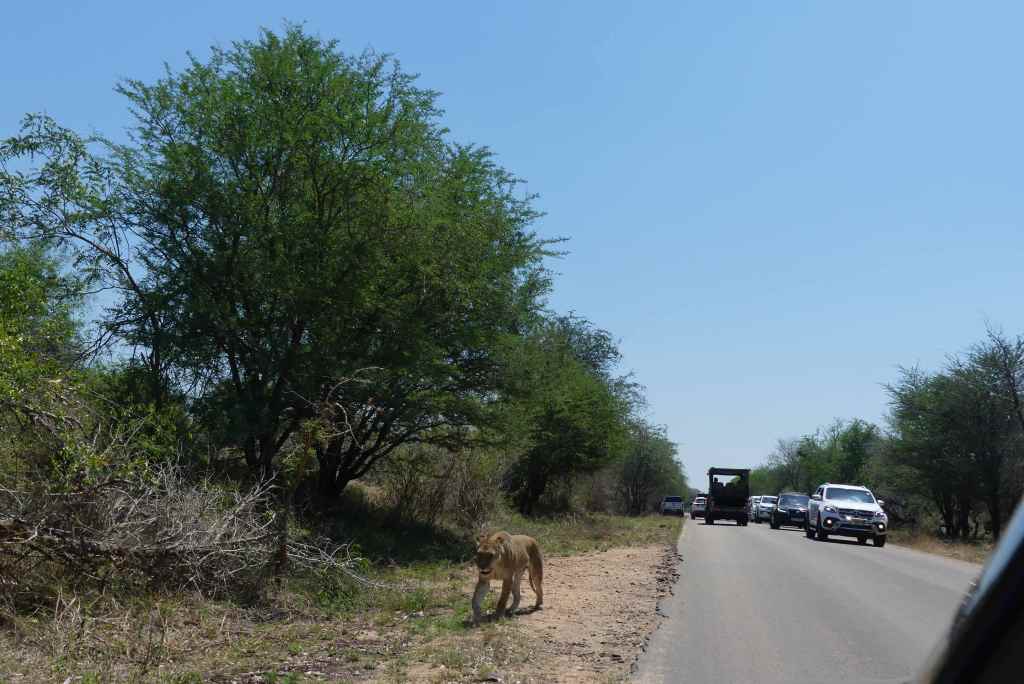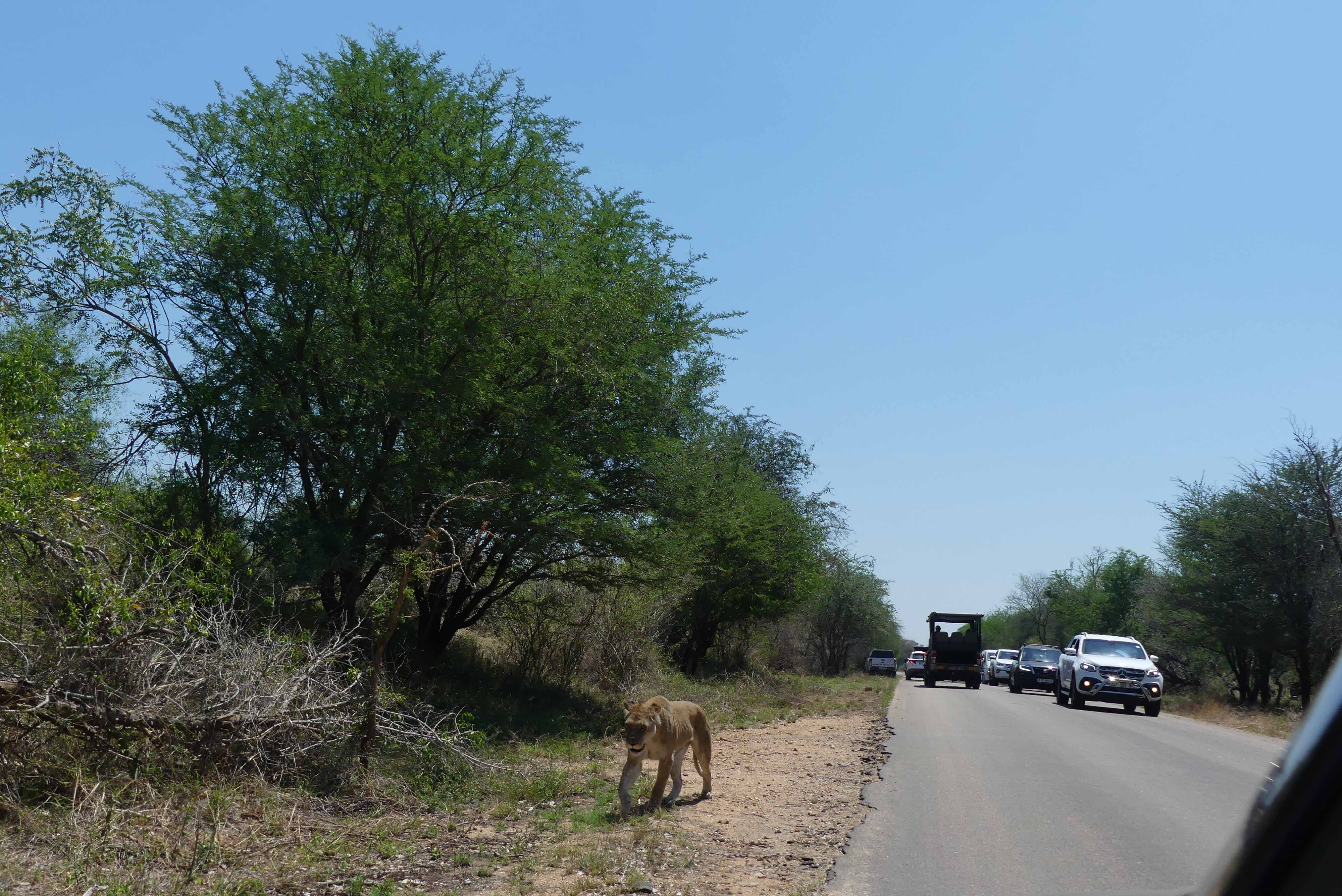 We were driving back (me complaining about the number of people and cars, as usual!) when we found ourselves facing a car convoy coming towards us. In front of the cars, a lioness was coming so, without having been involved in the affair, we were enjoying a close-up of the animal as all the other cars truly chasing her, stopped because of our presence!