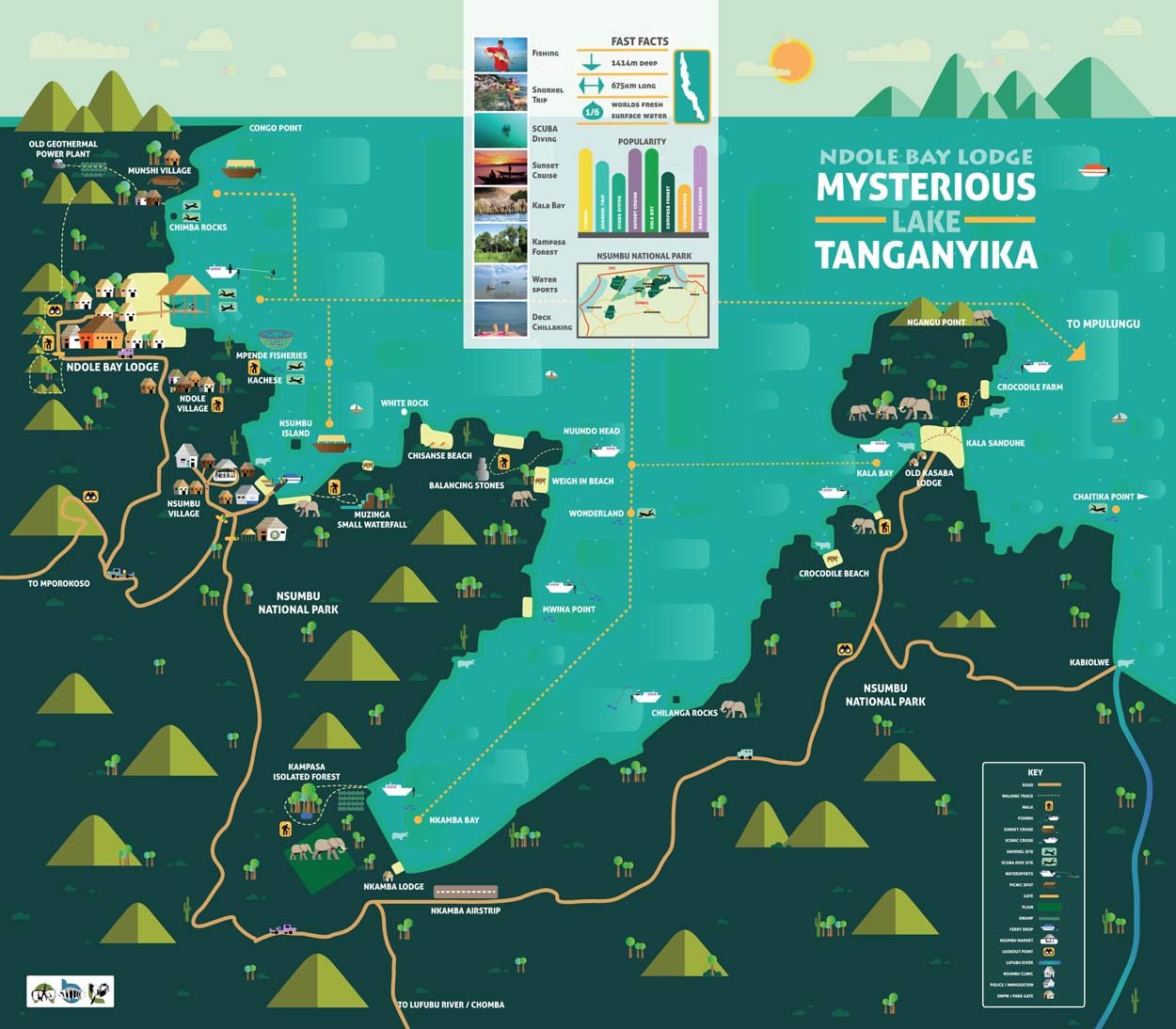 A great map of the area produced by Ndole Bay lodge. Nkamba Bay lodge is at the bottom left of the map. Copyright of Ndole Bay lodge (http://www.ndolebaylodge.com/)