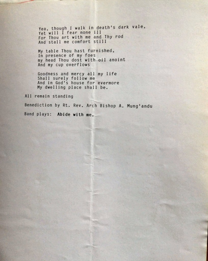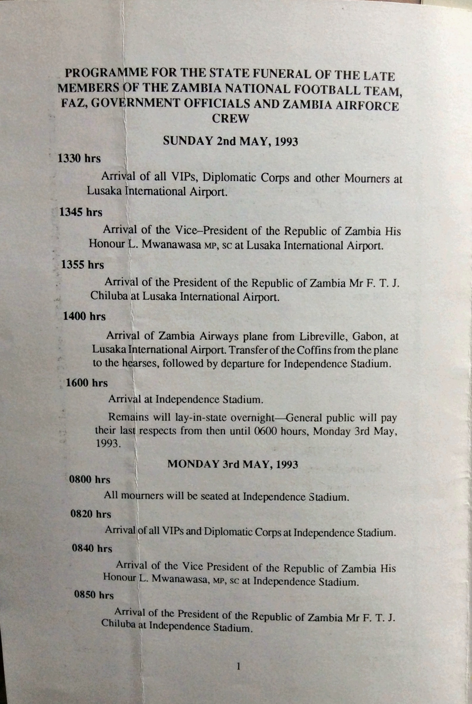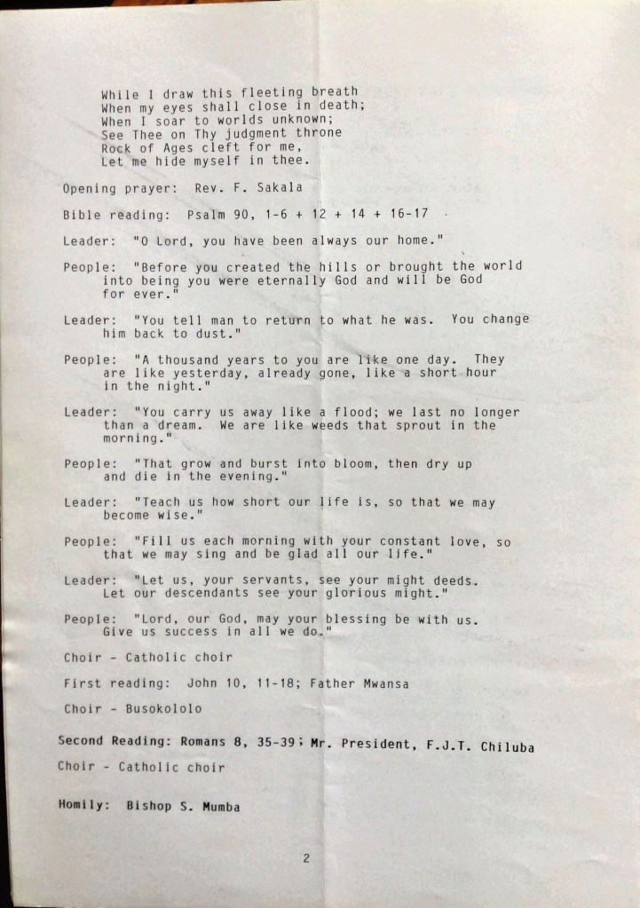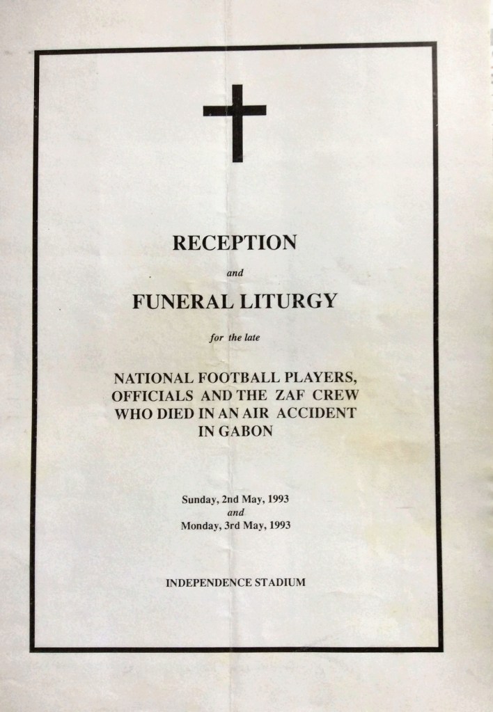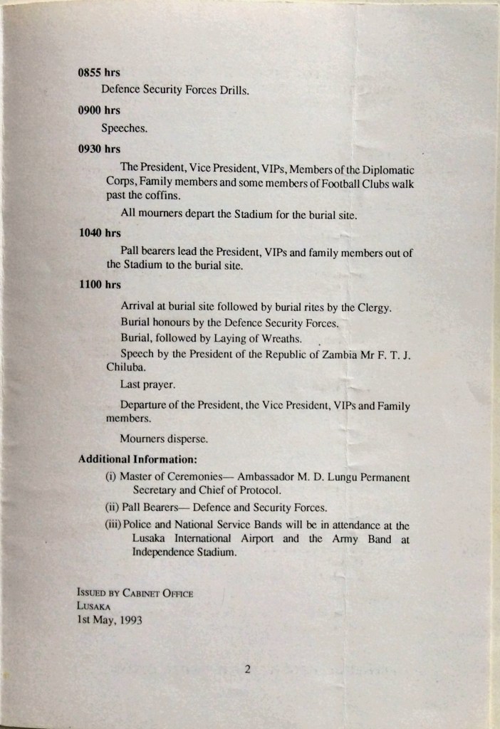 So it was that I attended a two-day funeral, the saddest job of my entire career. The ceremony took place at the soccer Independence Stadium on 2 and 3 May 1993. Below, I include the programmes of both the State Funeral and Liturgy as well as the list of the deceased.