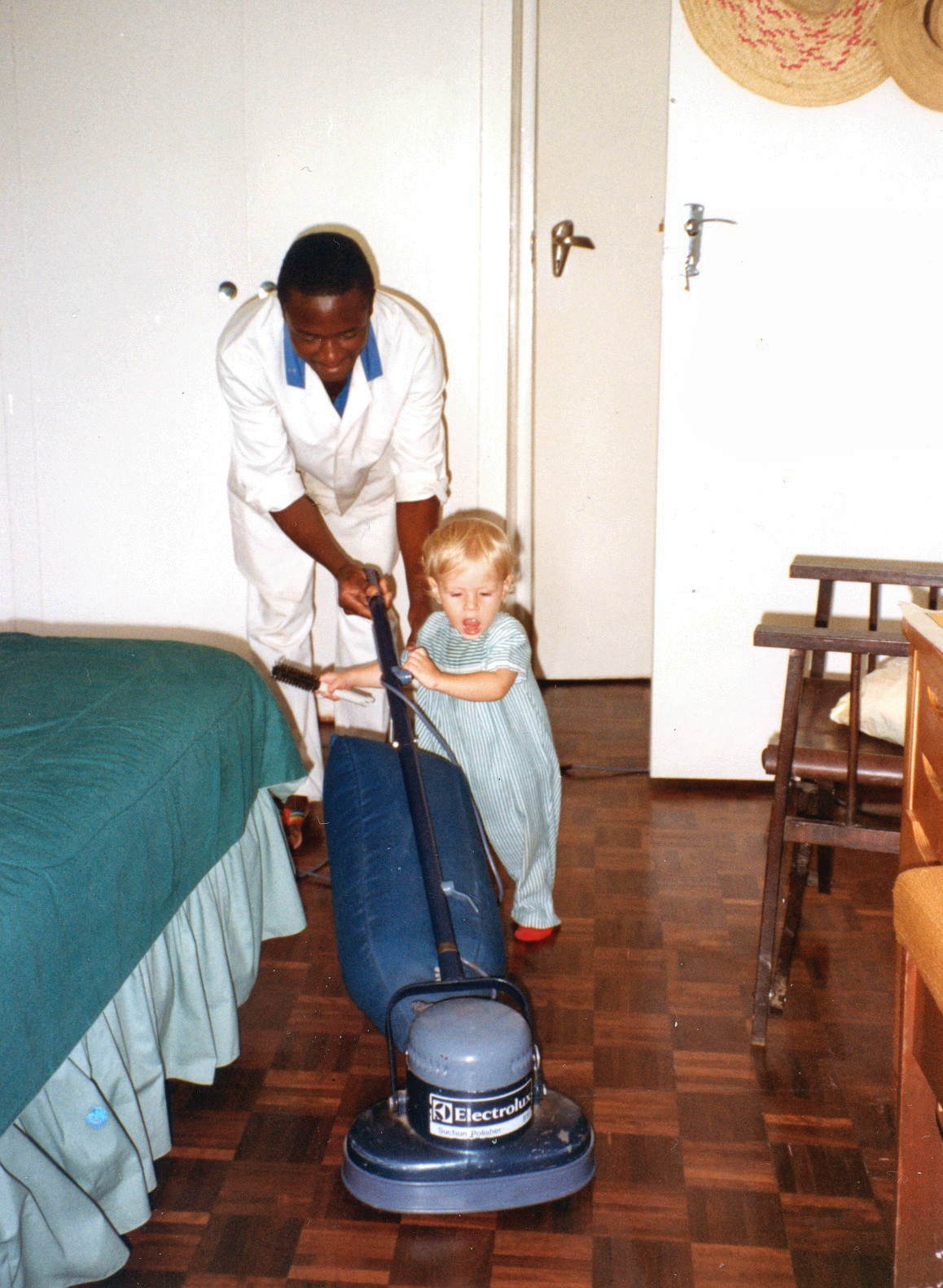 Emmanuel teaching our son Julio to “drive” the vacuum cleaner.