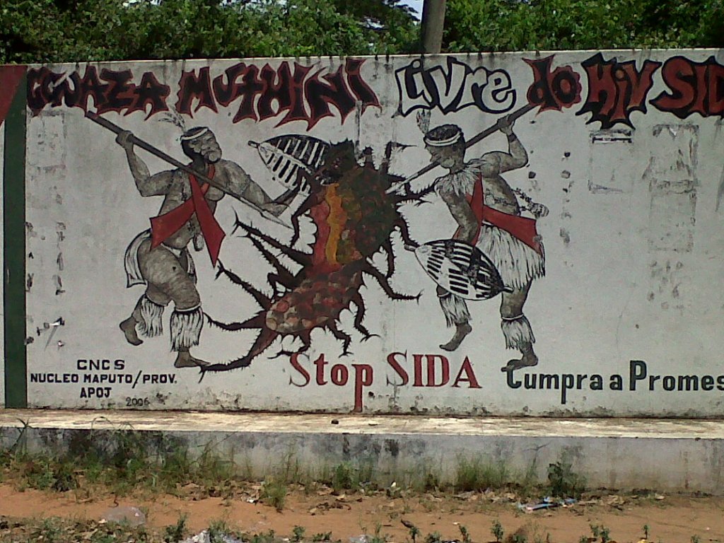 We no longer see billboards on preventing HIV such as the “ABC of AIDS control” I saw in Gaborone [1] or this fight between warriors and an imaginary and “plurilegged” AIDS (SIDA in Portuguese) monster!