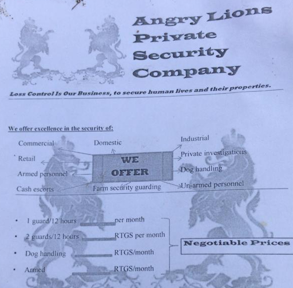 Security is a large business worldwide and Zimbabwe is no exception. While security companies choose allusive names such as “Safeguard”, “Guard Alert”, “Securico” and others, some of them do not.