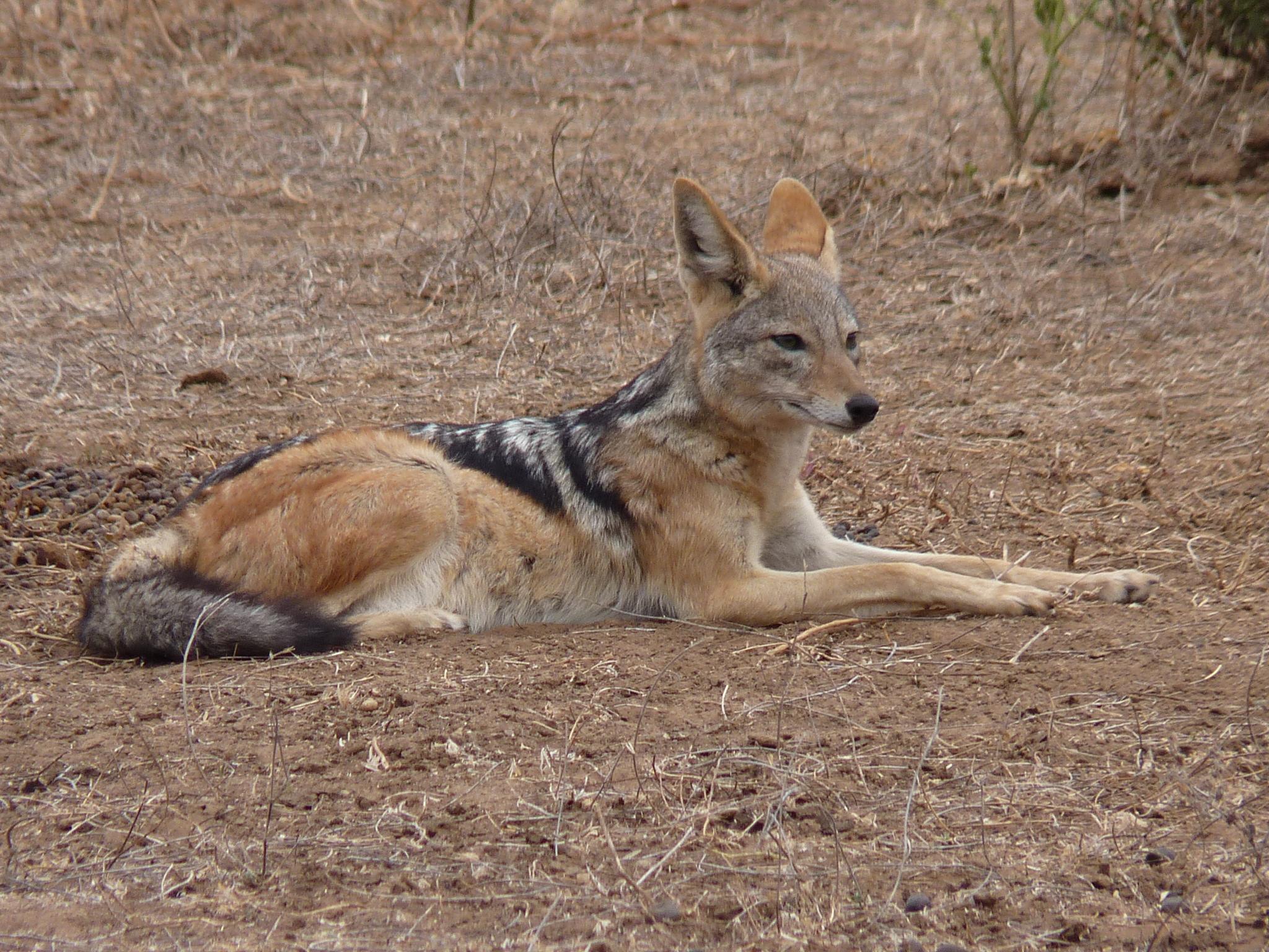 After about two kilometres we were surprised to find five jackals. One of them looked pregnant. Four slowly moved off but one remained all the time lying down, relaxing and returning our stare from time to time, its ears moving in all directions as not to miss anything. If they had a kill or were coming from one, we could not tell.