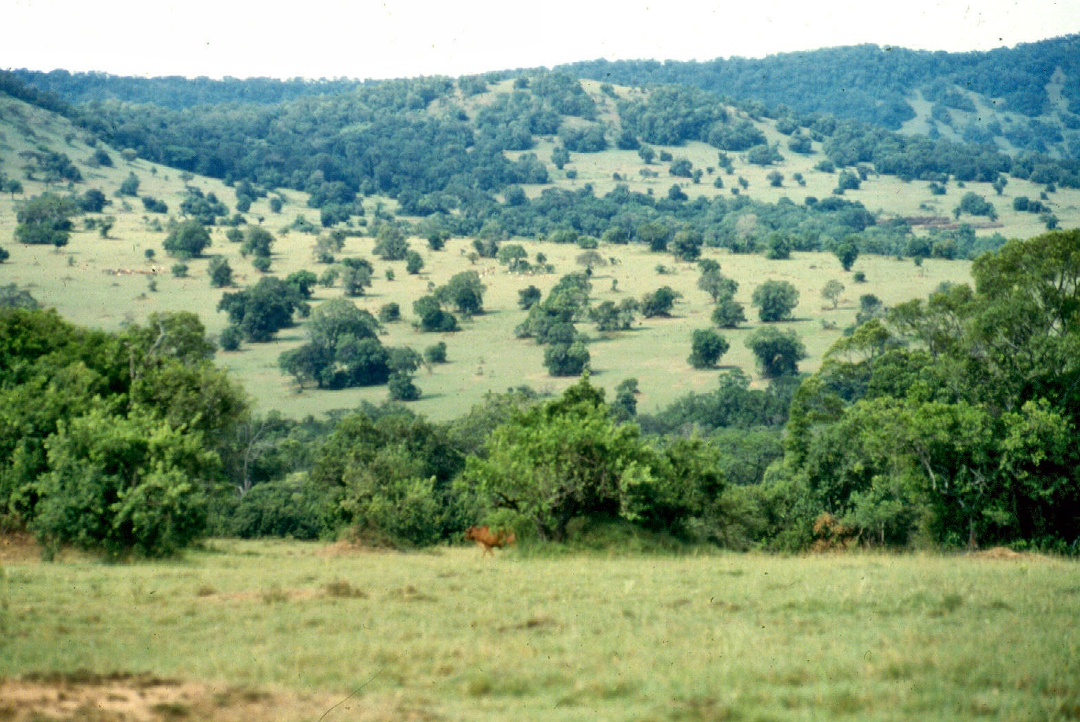 Scattered clumps of forest, many associated with very large termite mounds, with plenty of rare orchids speckled the landscape. This green oasis was maintained by rains that fell most afternoons due to the proximity of Lake Victoria. Apart from keeping the vegetation going, the evening storms produced the most striking sunsets that would turn red when the grass fires were raging around.