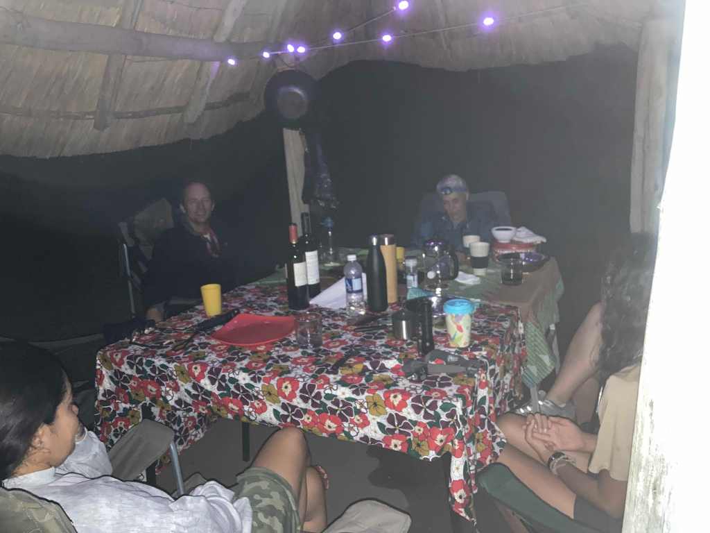Our camp at dinner time. From left to right: Nic, Mabel, Ana Laura (well, her leg!), Ana Lucía and Gabriela.